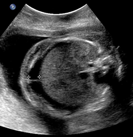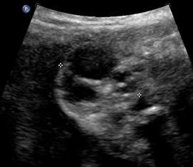 Above. Calcification. Case 2. 23 weeks gestation. Single echogenic focus in the liver with echogenicity equal to bone. No adverse clinical outcome was noted.