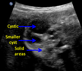 The differential diagnosis for calcifications within the fetal abdomen includes [17]: meconium peritonitis, infections (cytomegalovirus, toxoplasmosis, and varicella), and neoplasms (teratoma, neuroblastoma, hemangioma, and hepatoblastoma). The infectious origins favor calcifications in the liver and spleen. Many rare conditions are also associated with fetal intra-abdominal calcifications.
