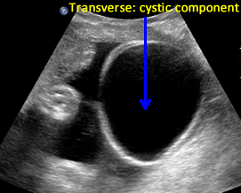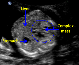Above. Umbilical vein varix. Case 1. Gestational age 33 3/7 weeks. Color Doppler demonstrates flow and confirms the diagnosis.