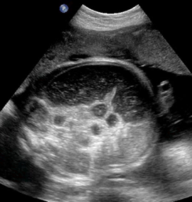 Above. Umbilical vein varix. Case 1. Gestational age 33 3/7 weeks. Oblique scan. Anechoic area within the fetal liver near the umbilical cord insertion site.