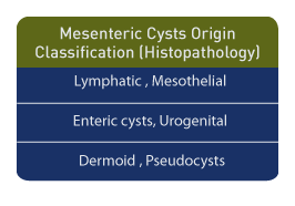 Mesenteric cysts are rare, accounting for only one in 140,000 hospital admissions after birth. [1] They are most often lymphatic in origin. Based upon histopathology, a classification scheme has been reported as follows: cysts usually of lymphatic origin, but which may also be of mesothelial, enteric, urogenital, dermoid, or pseudocyst origin. [2] Cystic lymphangioma may occur in the first decade of life, and there is a female predominance.