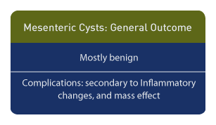 Although mesenteric cysts are benign, the occasional focal malignancy or stromal gastrointestinal tumors are noted. [6] The coexistence of a duplication cyst and a mesenteric cyst can result in a complicated inflammatory mass [7], and complications such as renal failure have been reported as a result of the mass effect. [8]