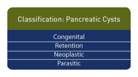 The congenital pancreatic epithelium lined cyst rarely has been reported and most, as expected, are seen in the left upper quadrant of the fetal abdomen, [63] while pancreatic pseudocysts and pancreatic cystadenoma may present as large cystic or cyst-like abdominal masses in children. [64] Prenatal diagnosis is usually made during the third trimester. The differential diagnosis includes mesenteric cyst, while a distinguishing feature for pancreatic cysts may be their occasional location in the retroperitoneal space. [65]