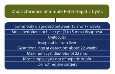 Hepatic cysts are commonly diagnosed between 13 and 17 weeks gestation. [35] Peripheral cysts of 3 mm to 5 mm frequently disappear upon follow-up scans. Hilar cysts may also disappear or become smaller during pregnancy or the neonatal period. A distinguishing feature for simple hepatic cysts is their unilocular nature and inseparability from the liver. [36]