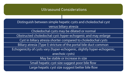 Hepatic cysts are rare findings on prenatal ultrasound [33], and cystic dilatation of the biliary tree may be due to choledochal malformations or biliary atresia. [34] Distinguishing the origin of cystic biliary dilatation is important because the prognosis is worse for biliary atresia compared to choledochal cysts.