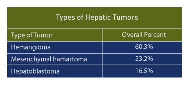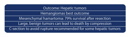 Solitary hepatic hemangiomas have the best outcome and hepatoblastoma have the worst outcome (25% survival). About half of the cases of hepatoblastoma have abnormally elevated serum alpha-fetoprotein. Seventy-nine percent of mesenchymal hamartoma patients survived who underwent resection.