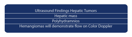 Above. This image represents a potential hepatic neoplasm. Of concern is the unexplained associated polyhydramnios. As noted previously, the three main hepatic tumors are hemangioma, mesenchymal hamartoma, and hepatoblastoma.