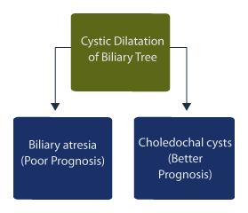 Others suggest early surgical intervention if suspected choledochal cysts demonstrate biliary obstruction, while non-obstructed patients may be explored at > 3 months of age. [44] Asymptomatic choledochal cysts may become symptomatic later in the neonatal period or later in life. [45] Distinct types of biliary atresia may also be associated with choledochal cysts. [46]