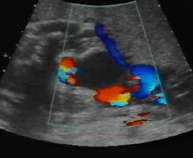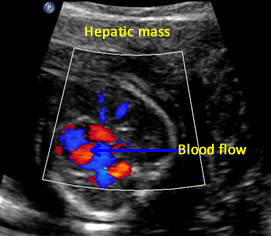 Above. Gestational age is 22 weeks. Potential hepatic tumor of mixed echogenicity. Color Doppler demonstrates blood flow to the heterogeneous mass. The differential diagnosis includes hemangioma or one of its varieties or hepatoblastoma.