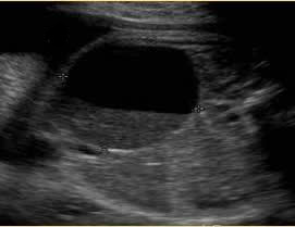 Above. Case 2. Mid-trimester scan. This image represents a probable mesenteric cyst, but an ovarian cyst should be considered due to the cyst location in the pelvis. Most ovarian cysts are detected in the third trimester.