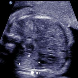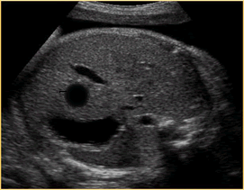 Above. Choledochal cyst. This schematic is of a large, unilocular anechoic cyst within the liver parenchyma in the upper right quadrant of the fetal abdomen. Small tubular bile ducts can sometimes be seen entering the cyst. Color Doppler will not demonstrate blood flow.