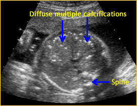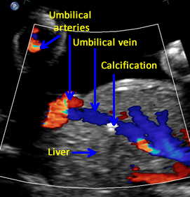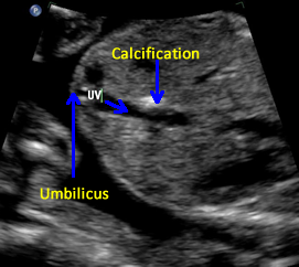 Above. Gestational age is 23 weeks. Isolated hepatic calcification.