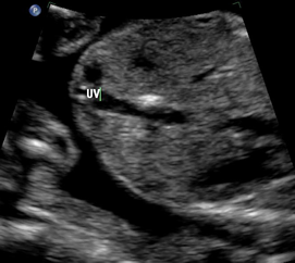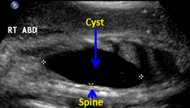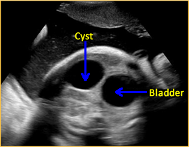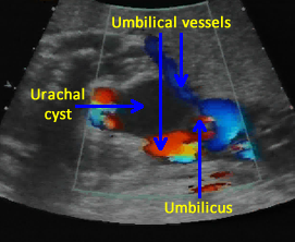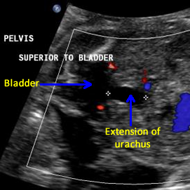 Urachal cysts present on the prenatal ultrasound as extra-abdominal cysts near the umbilical cord insertion site. These cysts typically connect with the fetal bladder through a channel which may change in size as the fetus voids. [59] Since the content of the cyst is urine and the channel contains urine, the cyst and channel will be anechoic.