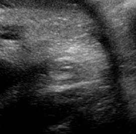 Above. Infra-diaphragmatic Pulmonary Sequestration (PS). Longitudinal view shows the same basic homogeneous, echogenic nature of the mass.