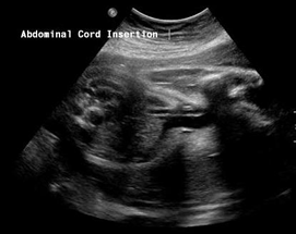 Above. 19 3/7 weeks. False positive finding for urachal cyst. Although there is an apparent anechoic structure at the umbilical cord insertion site, color Doppler demonstrated this to be an umbilical vein, which is dilated more than usual, but with no untoward outcome.