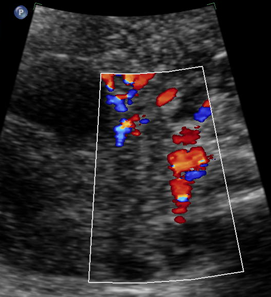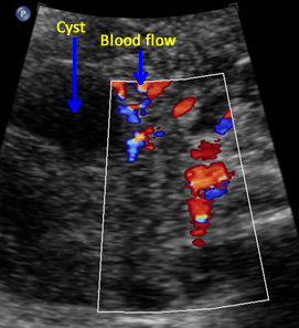 Above. Ovarian cyst. Case 1. 35 weeks gestation. Blood flow to the cyst is confirmed.