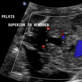 Above. Urachal cyst. Note the anechoic connection between the fetal bladder and the umbilicus.