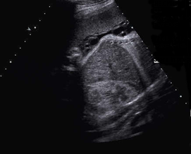 Above. Case 3. 28 3/7 weeks gestation. Transverse view of a cyst in the right upper quadrant.