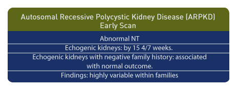 A nuchal translucency (NT) of greater than 3 mm. between 9 and 12 weeks may be associated with ARPKD. [48] Echogenic kidneys of normal size have been seen as early as 15 4/7 weeks gestation in patients with ARPKD. [49] Caution is urged when echogenic kidneys are observed in individuals without a history of genetic risk since normal outcome has been reported. [50] In addition, variable outcomes are possible and have been reported among affected fetuses from a single family. [51]