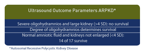 Both clinical outcomes and ultrasound findings are variable in ARPKD. The classic ultrasound findings include bilateral symmetrically enlarged echogenic kidneys with a normal pulsatility index (P-I) of the renal artery. [52] Renal echogenicity is defined as renal parenchymal echogenicity which is greater than that of the liver. Oligohydramnios and lack of fetal bladder distention are additional features. [53] In some cases of ARPKD, normal kidney echogenicity may be present as late as 30 weeks, and oligohydramnios and absent fetal bladder filling may be present in a minority of affected pregnancies. [54] Therefore, oligohydramnios is characteristic of ARPKD but is not always present. [55] However, when present, severe oligohydramnios and renal size are predictors of long-term outcome. Among 14 fetuses no survivors occurred when fetal kidney size was > 4 standard deviations in the presence of severe oligohydramnios. [56] Among 10 infants with oligohydramnios, two of whom had ARPKD, seven of eight children survived and had normal developmental outcomes. [57]