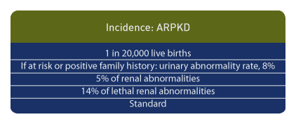 ARPKD occurs in approximately 1 in 20,000 live births. [1] In women referred for prenatal ultrasound who are at risk or have a family history of urinary tract anomalies, the urinary tract abnormality rate is approximately 8%, but in women with suspected urinary anomalies and with no family history of renal disease, abnormalities of the urinary tract occur in 64%. [34] In another study, ARPKD occurred in 3 of 58 cases of congenital renal malformations. [35] Overall, ARPKD occurs in a minority of patients with fetal urinary malformations. [36] Among lethal urinary tract anomalies, this condition accounts for approximately 14% of cases. [37]