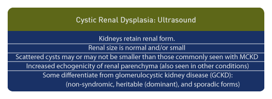Since there is an overlap in diagnostic criteria among echogenic and cystic renal diseases, the following patient information should be considered: clinical data, family history, general family history of renal abnormalities, other fetal malformations, and fetal syndromes. [46] In addition, in all cases of lethal renal malformations, autopsy is essential since the risk of recurrence is variable between ARPKD (25%) and multi-cystic dysplastic kidney (MCDK) (3%). [47]