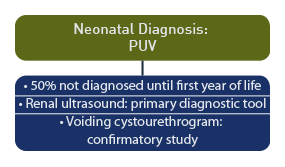Despite the widespread adoption of antenatal ultrasound, over 50% of patients with PUV are not diagnosed until the first year of life. [31] Renal ultrasound is used to assess the degree of hydronephrosis, the presence of bladder wall thickness, and the presence of echogenic and/or dysplastic cystic kidneys. A voiding cystourethrogram provides diagnostic confirmation of antenatal diagnosis of PUV.